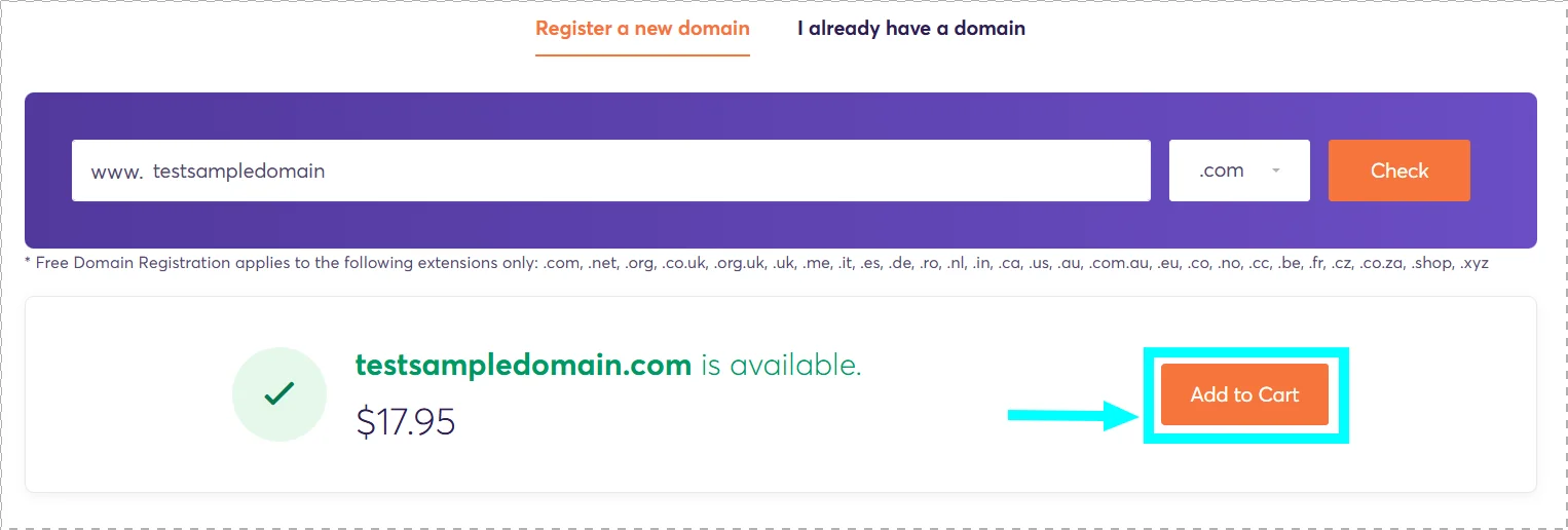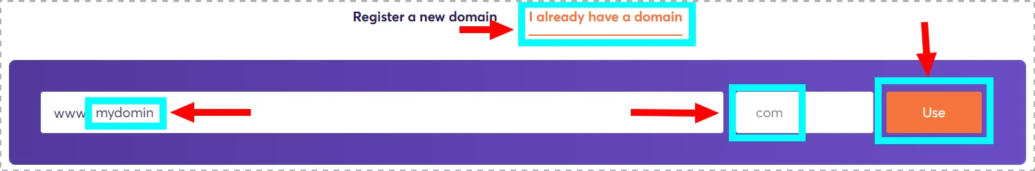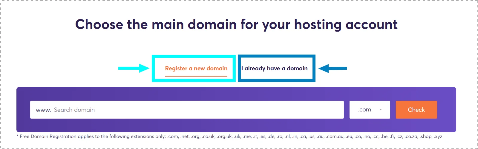 선택한 상품 아래 있는 “Order Now"를 클릭하면 아래와 같이 도메인 선택/설정하는 페이지가 나옵니다. 기본 적으로 Register a new domain(신규 도메인 등록)으로 되어 있고 바로 오른쪽에 I already have a domain(나는 사용할 도메인이 있다)를 선택해도 됩니다.