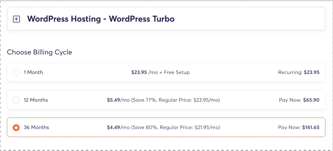 1편에서 설명한 부분이라 간단하게 살펴보면 호스팅 유형(일반/워드프레스)을 선택한 후, 3가지 상품(Starter/Pro/Turbo) 중 필요에 맞는 것을 고르면 됩니다.워드프레스 블로그 운영 목적이라면 큰 차이는 없으나 워드프레스에 최적화된 설정 제공하는 WordPress Hosting을 권장하고 1년만 운영할 것이 아니라면 3년 플랜으로 선택하는 것을 고려 해보세요.