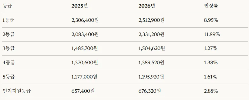 2026년 재가급여 월 한도액은 등급별로 1만 8,920원~24만 7,800원 인상되었으며, 특히 1·2등급 중증 수급자는 20만 원 이상 대폭 인상되었습니다.