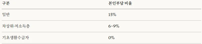 월 한도액의 15%가 본인부담금입니다. 나머지 85%는 국민건강보험공단에서 부담합니다. 예를 들어 3등급(한도액 약 150만 원)이라면 일반 기준 본인부담금은 월 22만 원 정도입니다. 단, 한도액을 초과하면 초과분은 100% 본인 부담이므로 계획적으로 사용하셔야 합니다.