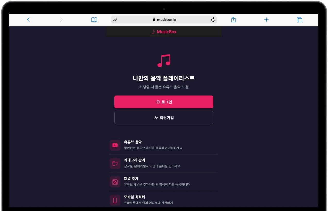 뮤직박스는 유튜브 음악을 카테고리별로 등록하고 광고 없이 연속 재생할 수 있는 무료 웹 서비스입니다.