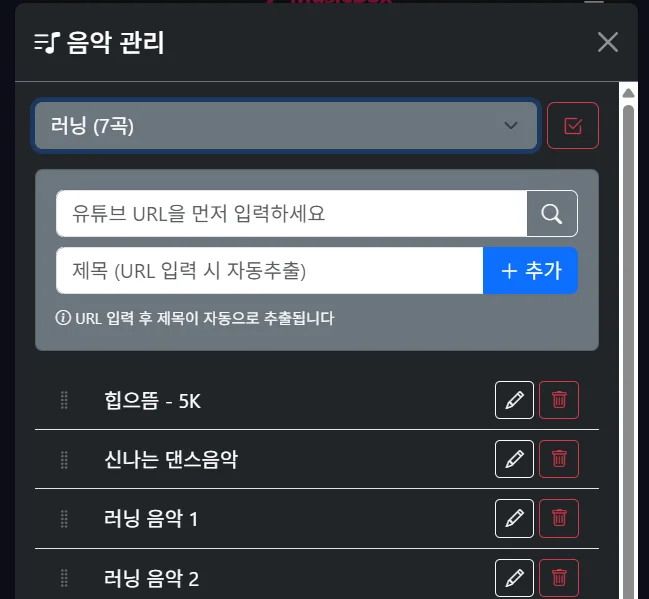 유튜브에서 공유 버튼을 눌러 링크를 복사한 뒤 뮤직박스에 붙여넣기만 하면 됩니다. 제목과 링크가 자동으로 입력되어 별도로 타이핑할 필요가 없었습니다. 러닝용 음악을 10곡 이상 등록하는 데 5분도 걸리지 않았습니다.