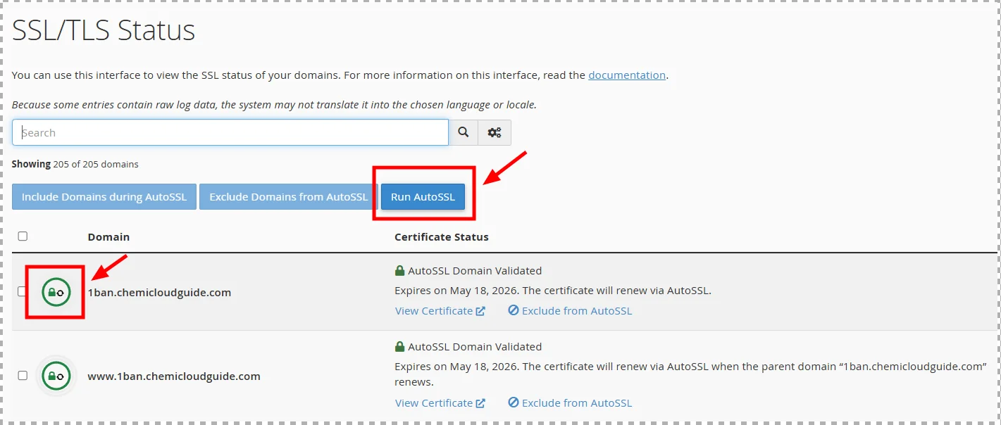 케미클라우드는 Let's Encrypt 기반의 무료 SSL 인증서를 자동으로 발급해줍니다. cPanel의 Security 섹션 > SSL/TLS Status 메뉴로 이동하면 서버에 등록된 도메인별로 SSL 적용 상태를 한눈에 확인할 수 있습니다. 방금 추가한 도메인이 목록에 보이고 인증서가 정상 발급되어 있다면 바로 다음 단계로 넘어가도 됩니다. 일반적으로 도메인을 추가하면 자동으로 SSL 설정을 할 필요가 없습니다만 만약 인증서가 아직 발급되지 않았거나 오류 상태라면, 'Run AutoSSL' 버튼을 눌러 수동으로 발급을 요청할 수 있습니다. 이 역시 네임서버 변경이 완전히 전파된 이후에 정상적으로 작동하니, 도메인 전파 시간을 충분히 기다린 뒤 진행하는 것이 좋습니다.
